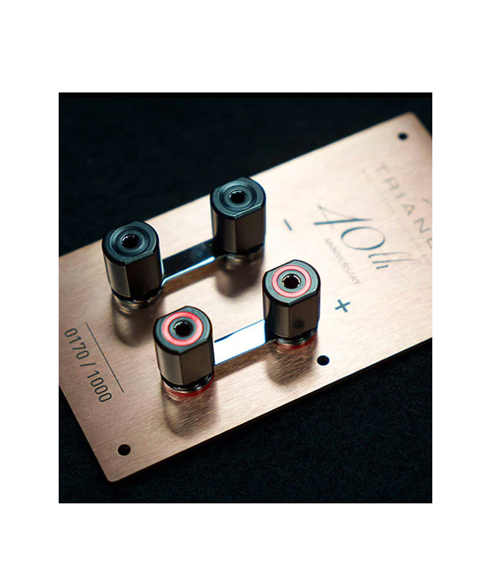 Le bornier de la gamme 40ème Anniversaire est en aluminium brossé anodisé or rosé. Les bornes isolées, conçues sur-mesure, peuvent accueillir un câble de section allant jusqu’à 5 mm de diamètre. Elles peuvent également recevoir des fiches bananes, pouvant être verrouillées lors du vissage de la partie supérieure.
