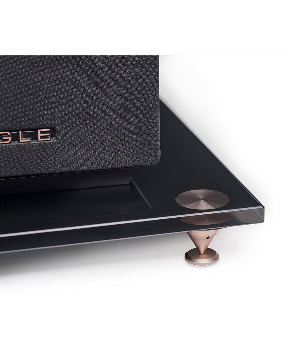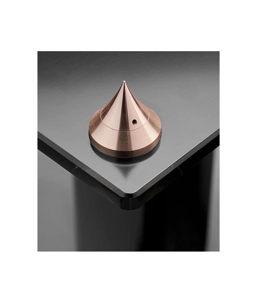 Deux jeux de pointes de découplage sont fournis avec les enceintes 40th : le premier ajustable en hauteur, en aluminium or rosé, fourni avec contre pointes pour des surfaces type moquette et le second en caoutchouc pour des surfaces plus rigides.