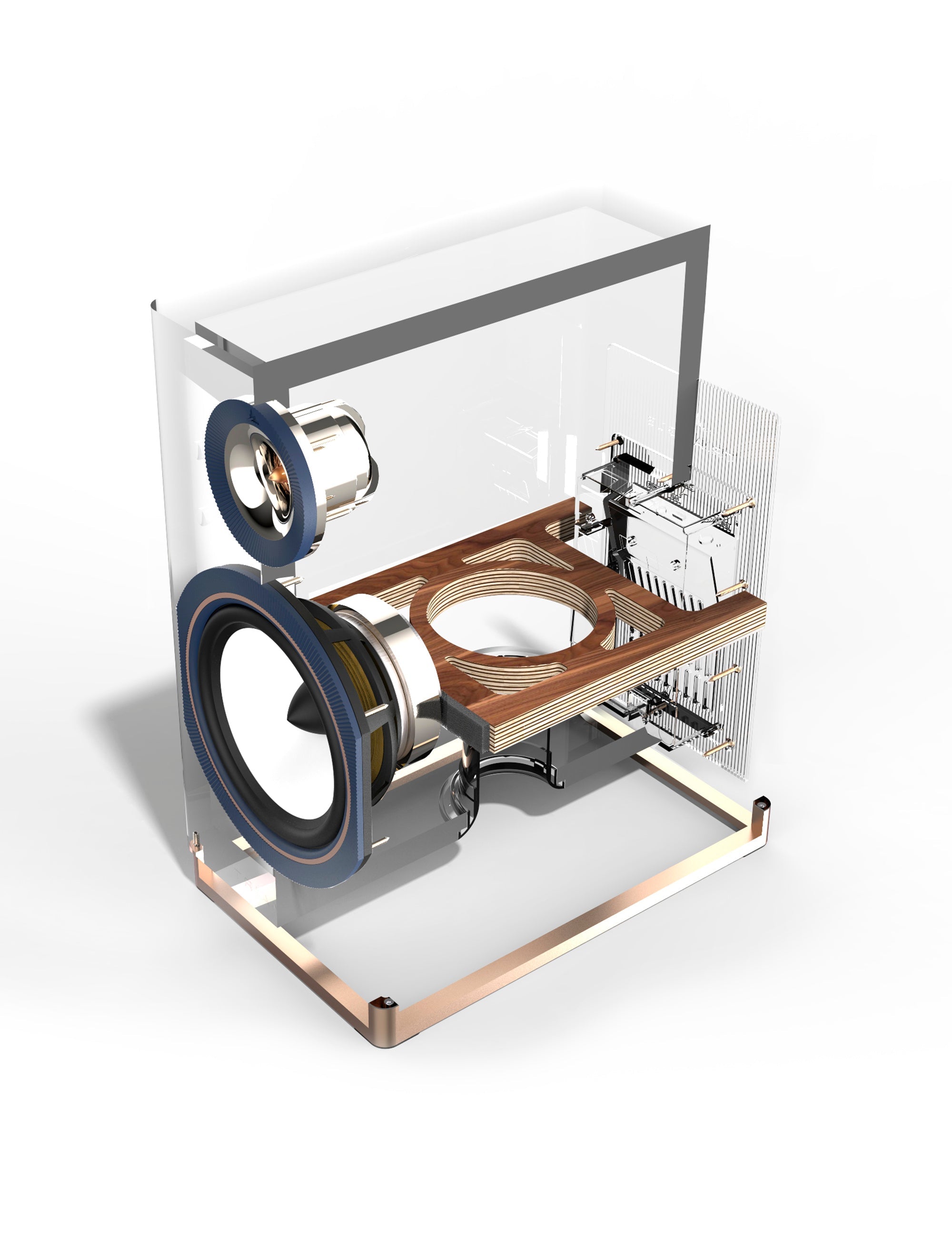 Les enceintes Capella sont surélevées par un socle en aluminium permettant un écoulement d’air dégagé autour de l’évent bass-reflex. Ce principe permet une diffusion homogène des basses fréquences autour de l’évent tout en restituant les fréquences médium en façade de manière plus fluide.