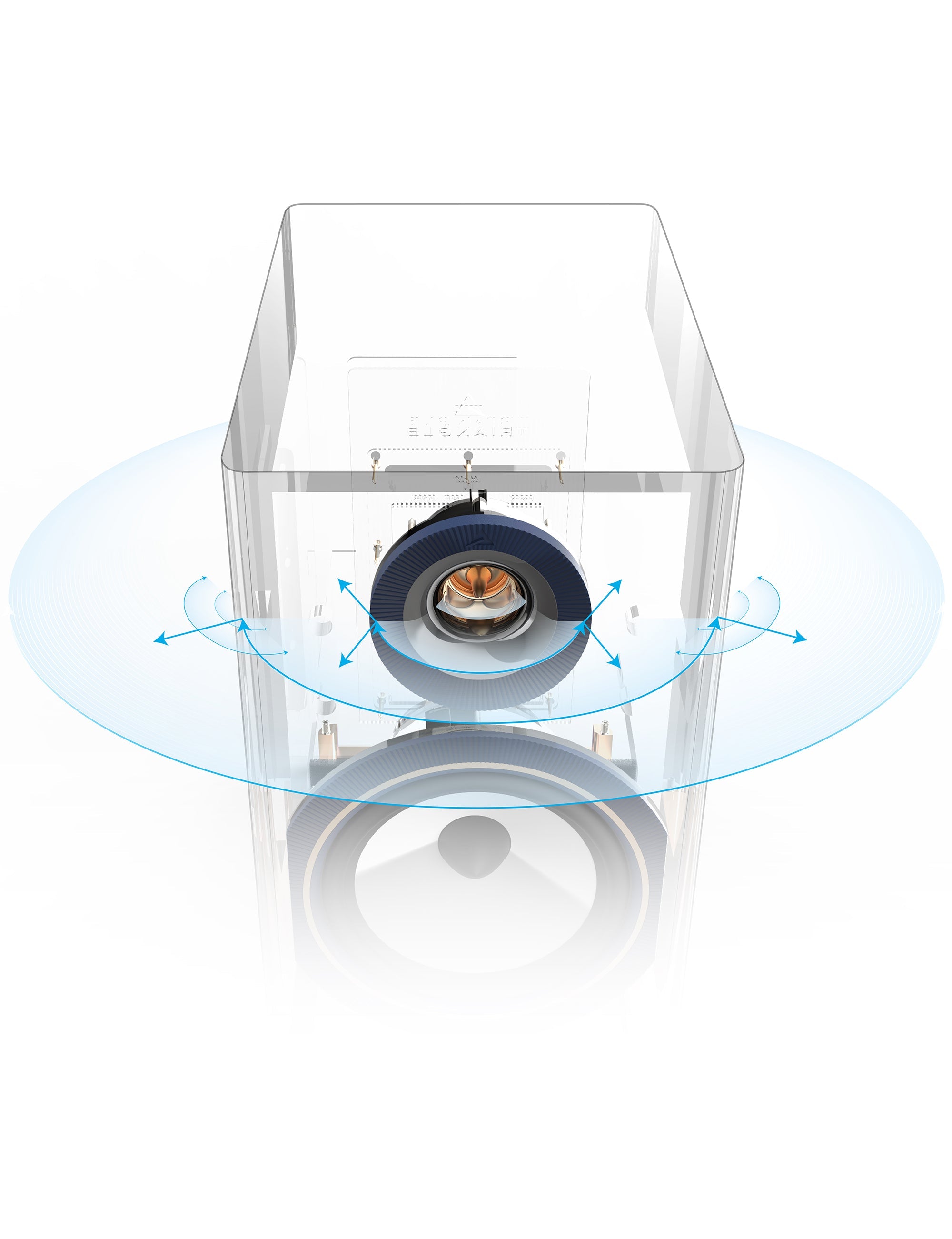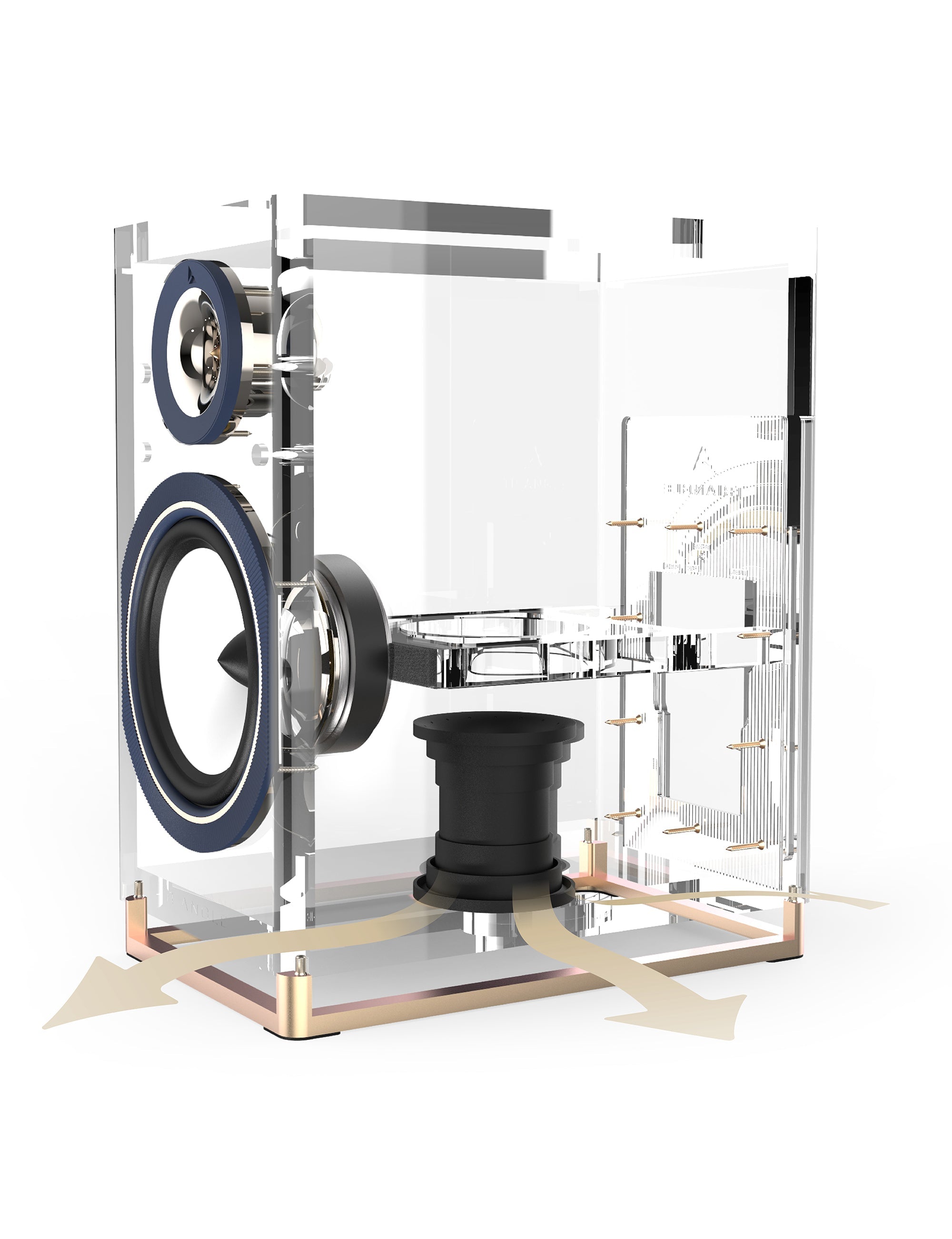 L’architecture interne des enceintes a été optimisée autour de cet évent qui est évasé à ses deux extrémités. Cela permet de réduire efficacement les bruits d’écoulement d’air et de diminuer le taux de distorsion harmonique.