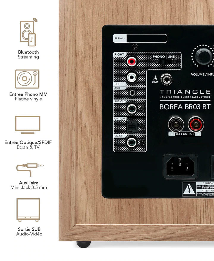 The amplifier of the BOREA Active speaker integrates a MM Phono preamplifier, which allows you to connect your turntable directly to the active speaker and enjoy a warm sound when listening to your 33 & 45 rpm records.